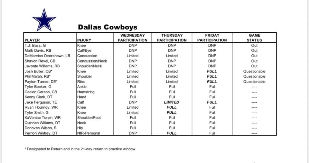 As you can see, Dallas has ruled out five total players, while three others are questionable. Four of them are starters and the other one is the backup running back, Malik Davis.