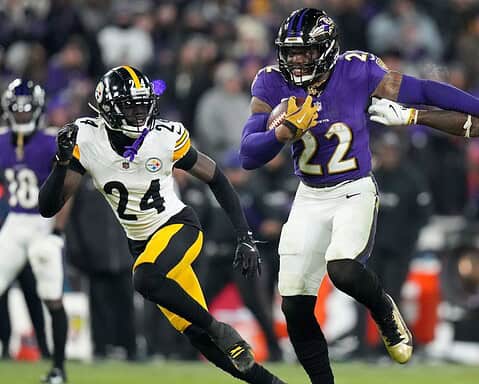 Early in the first half, Lions’ QB Jared Goff took a shotgun snap and handed off to electric RB Jahmyr Gibbs on a sweep to the left side.